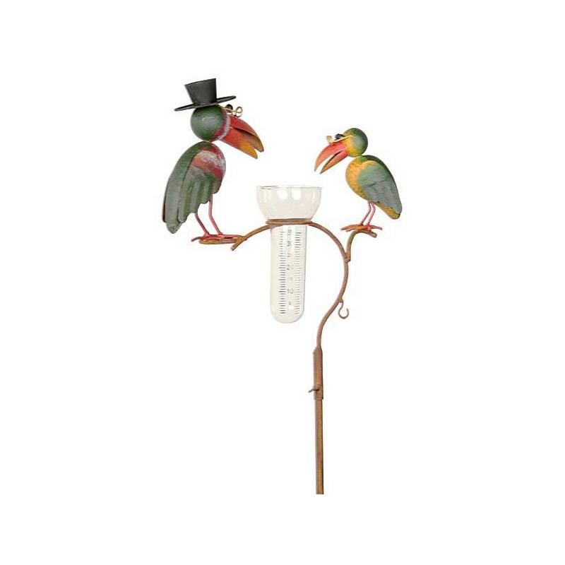 Ce magnifique pluviomètre est constitué d'une tige à piquer en métal patiné, et d'une branche ornée de deux corbeaux colorés et d'un tube graduée de 0 à 35mm.