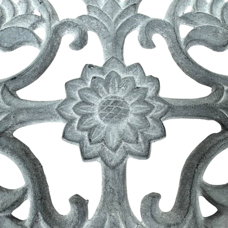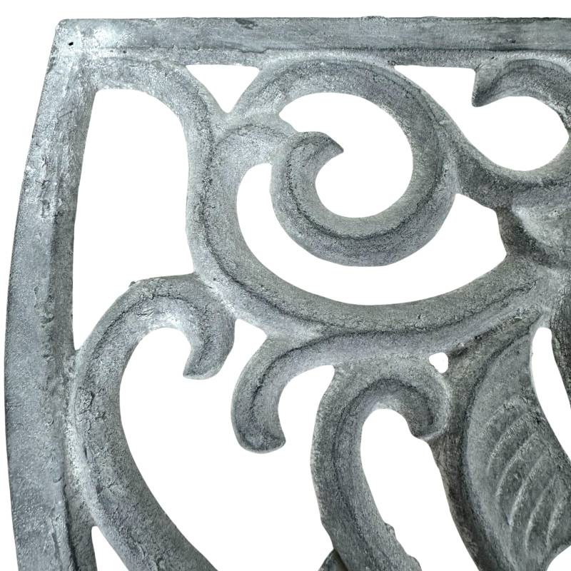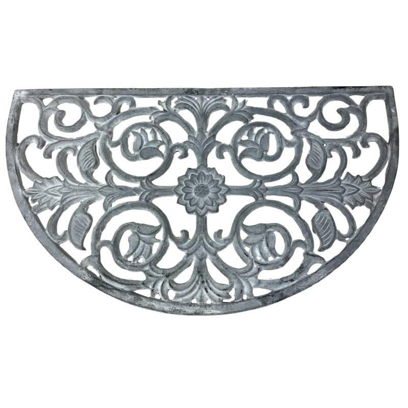 Ce très beau paillasson, en forme de demi lune, est en fonte de couleur grise. Il arbore de séduisants motifs symétriques: arabesques et feuilles. Sa conception en fonte, fait de lui un modèle robuste et extrêmement stable, qui traversera les saisons sans soucis.