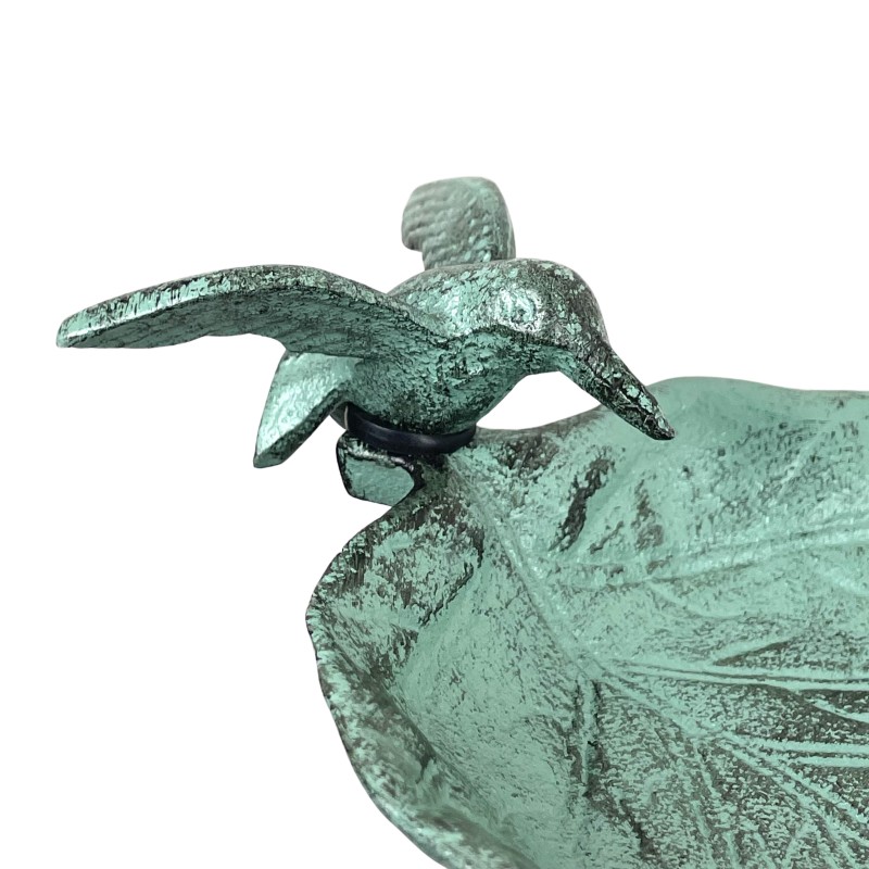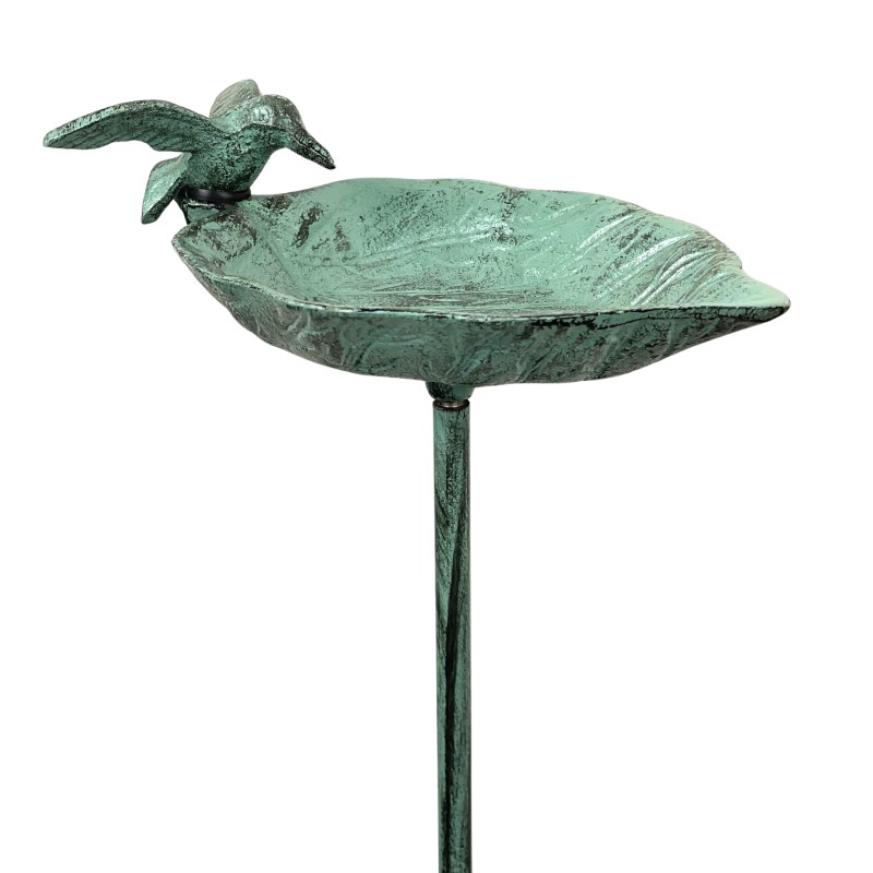 Ces deux pics de jardin sont en fonte recouverte d'une jolie patine de couleur verte et surmontés de charmants petits oiseaux en fonte aux ailes fermées. Très bien conçues, ces tiges qui supportent deux coupelles à la façon de bénitiers trouveront avec aisance leur place dans votre environnement extérieur.
