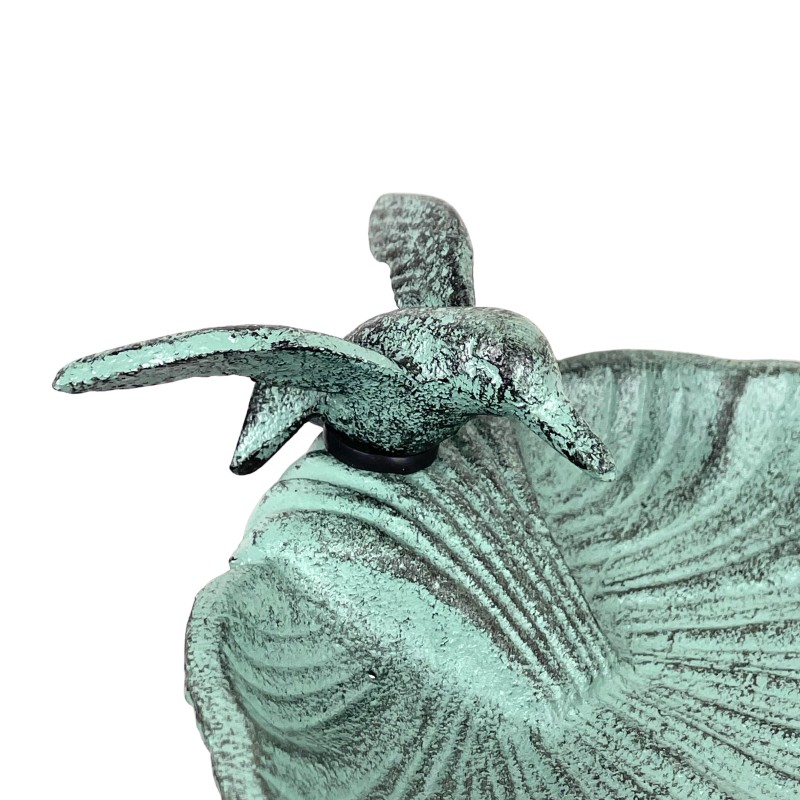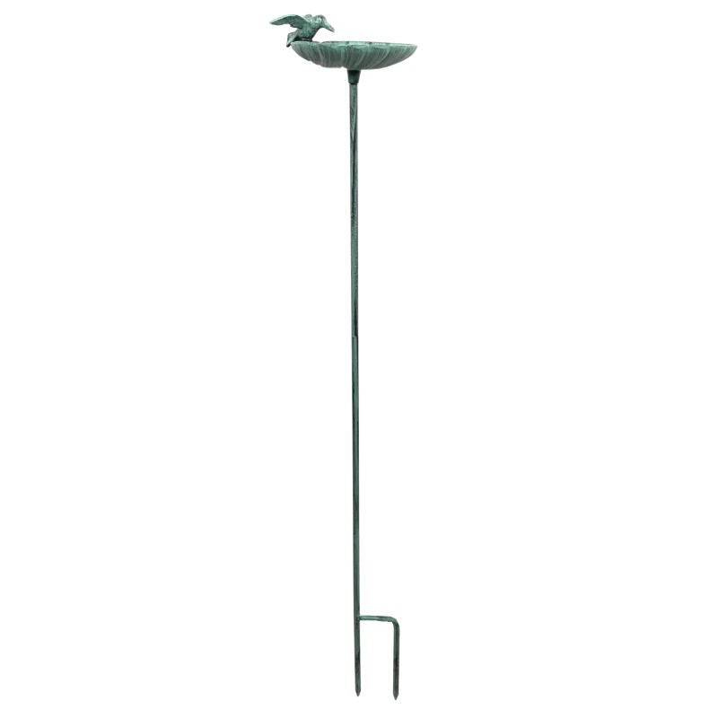 Ce pic de jardin est en fonte recouverte d'une jolie patine de couleur verte et surmonté d'un charmant petit oiseau en fonte aux ailes fermées. Très bien conçues, cette tige qui supporte une coupelle à la façon d'un bénitier trouvera avec aisance sa place dans votre environnement extérieur.