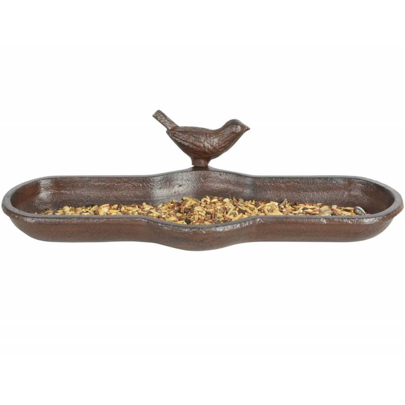 Disponible en marron, ce petit bac à fleurs de forme rectangulaire est surmonté par un oiseau.