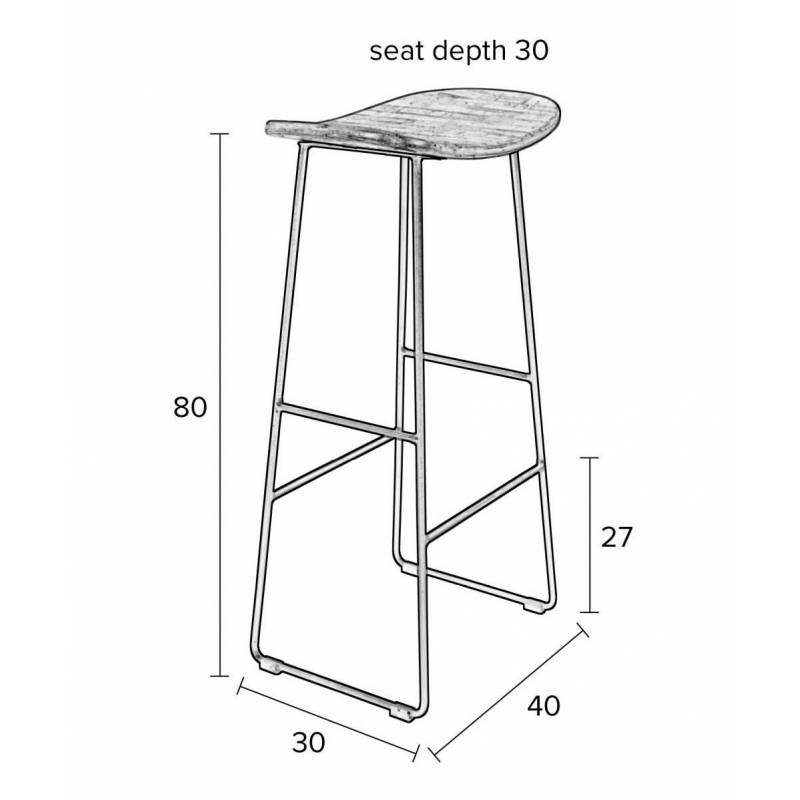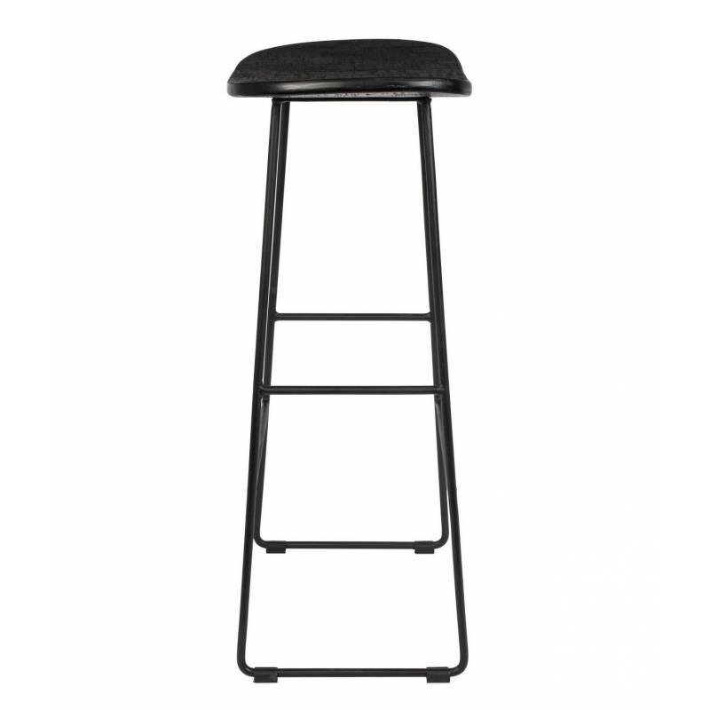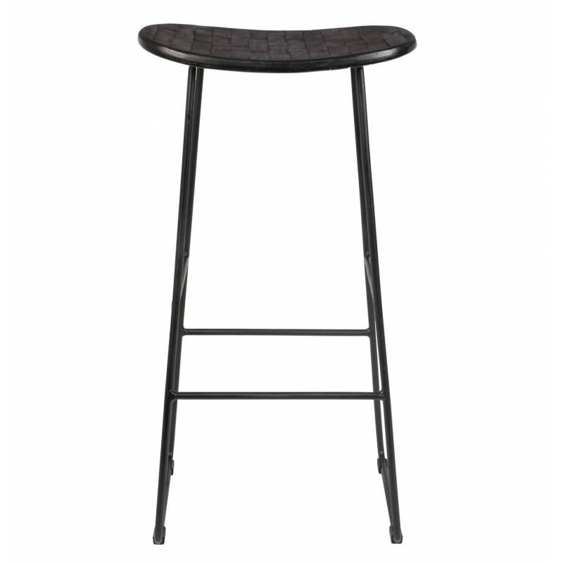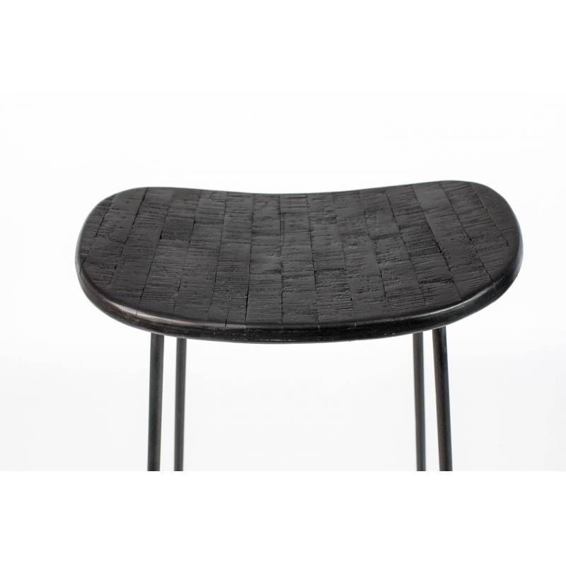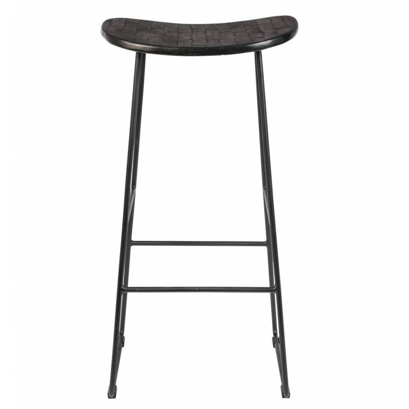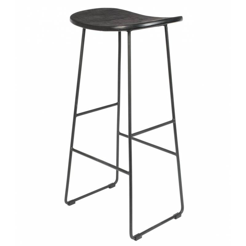 tabouret de bar ou de comptoir réalisé à partir d'une ossature en acier peinte de couleur noire, sur laquelle repose une assise en bois naturel cintrée. Sur chacune de ses faces, se trouve un repose pieds pour toujours plus de confort.