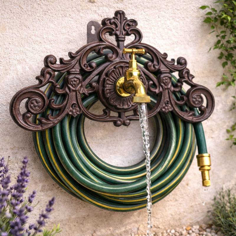 Voici l'enrouleur-fontaine ! Un produit réalisé en fonte patinée marron. Mural il se fixe aisément à votre mur.