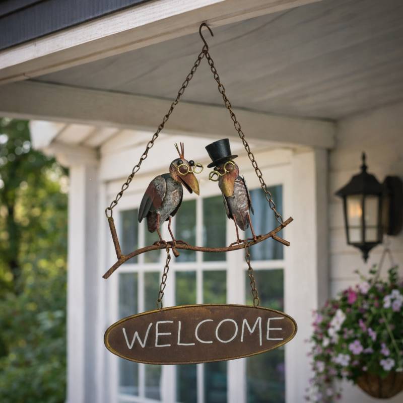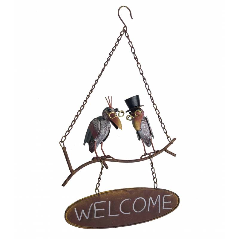En voila une bien jolie décoration de jardin à suspendre. Réalisée en acier patiné marron, cet écriteau reçoit une inscription Welcome surmontée de 2 corbeaux colorés.