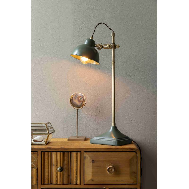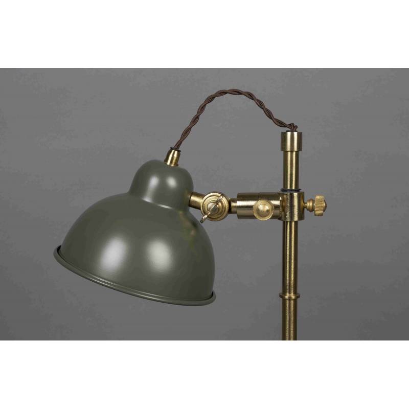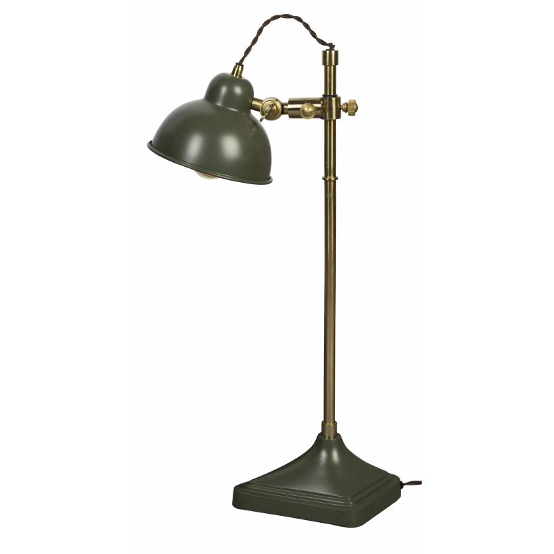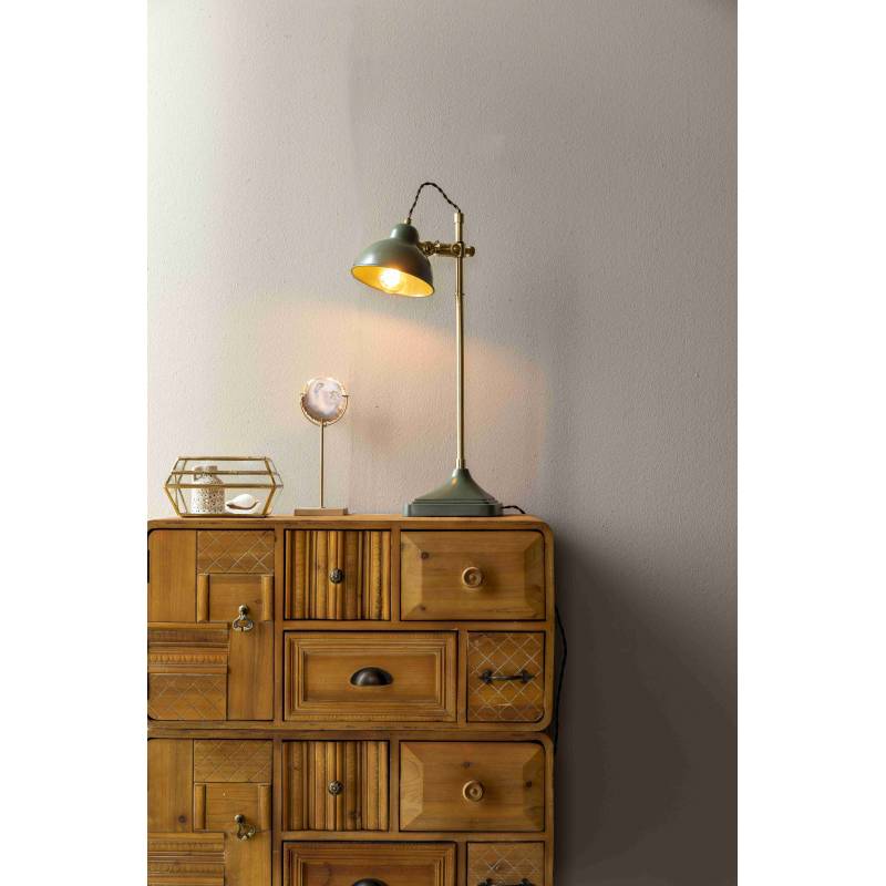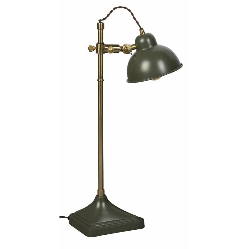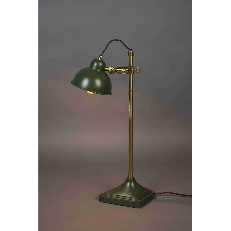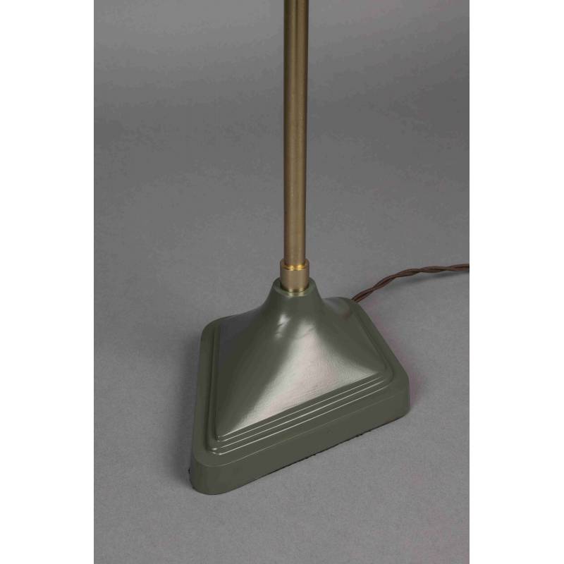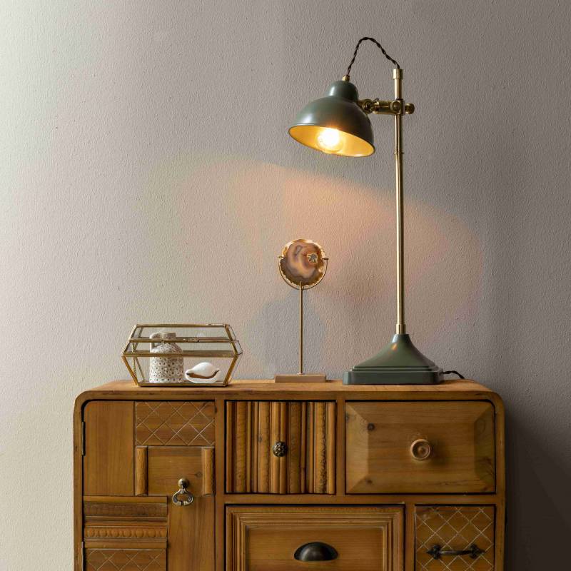 Sa composition tout en métal et son esthétisme nous rappelle les anciens luminaires des bibliothèques universitaires et grands cabinets de notaires. De plus, le choix des coloris, vert mat pour sa base carrée et son abat-jour rond et laitonné pour sa tige, lui donne encore plus ce côté vintage revisité.