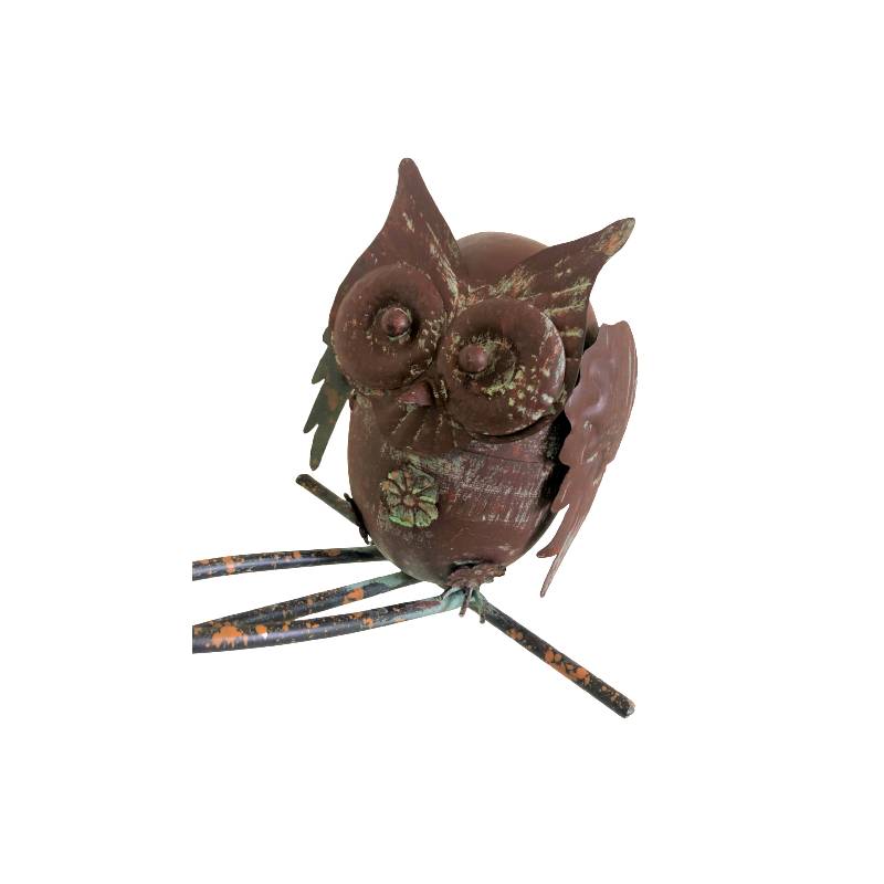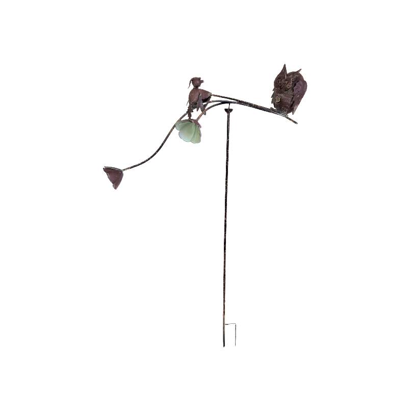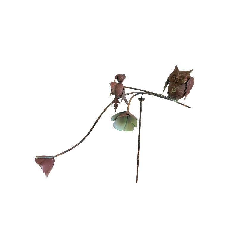 En métal marron, ce tuteur pour plantes est composé d'une tige se terminant par un pic afin de le planter facilement dans votre sol. Il est doté d'une partie supérieure décorée d'une jolie chouette perchée d'un côté, d'un oiseau au centre et de deux jolies fleurs de l'autre côté.