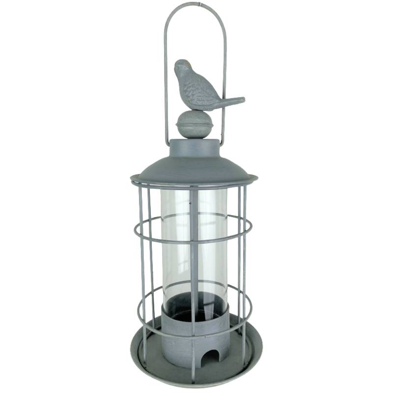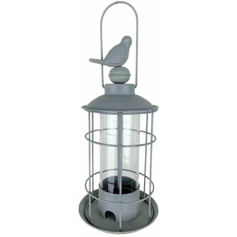Cette petite cabane pour oisillons, à la façcon d'une lanterne, est en fer patiné gris. Cette jolie maisonnette est composée d'une coupelle et d'un tube en verre où vous pourrez mettre des graines pour les oiseaux. Le tout est protégé par une coupole où est posé un petit moineau.