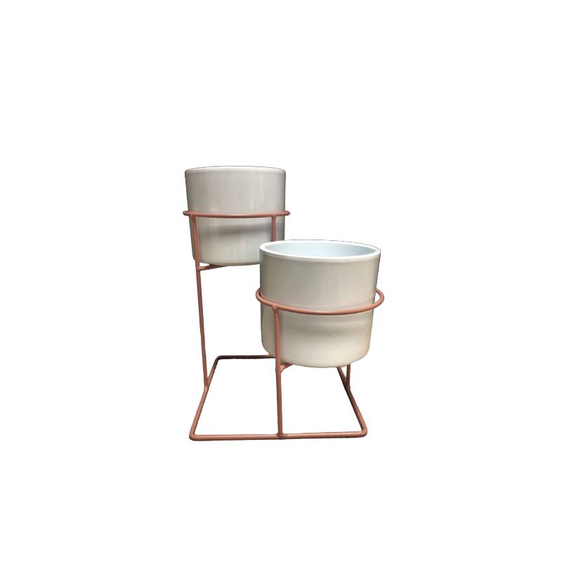 Tout en métal de couleur rose poudrée, il est accompagné de deux cache-pots en céramique blanche prêts à recevoir vos jolies plantes. Parfaitement stable, vous pourrez l’utiliser en intérieur comme en extérieur.