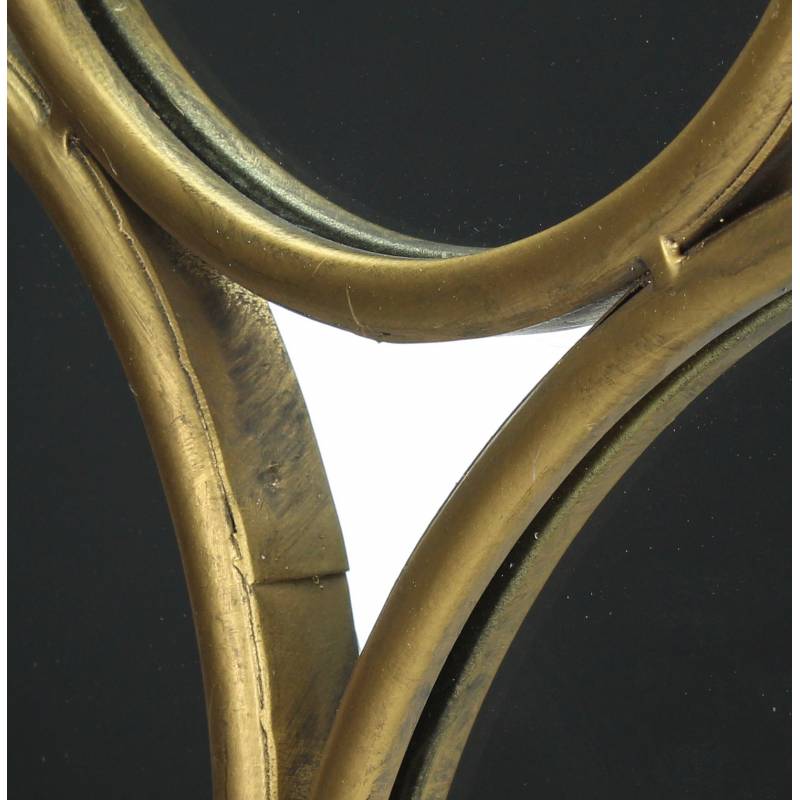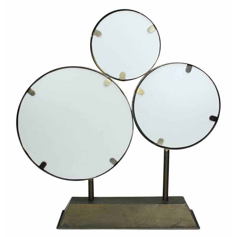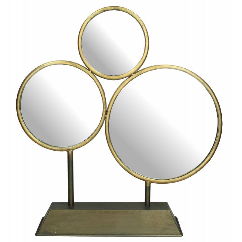 Ces trois jolies glaces rondes en métal couleur laitonnée sont montées sur une base rectangulaire en métal noir. De différentes tailles, elles sont collées entre elles de sorte à vous permettre de vous relooker sous tous les angles.