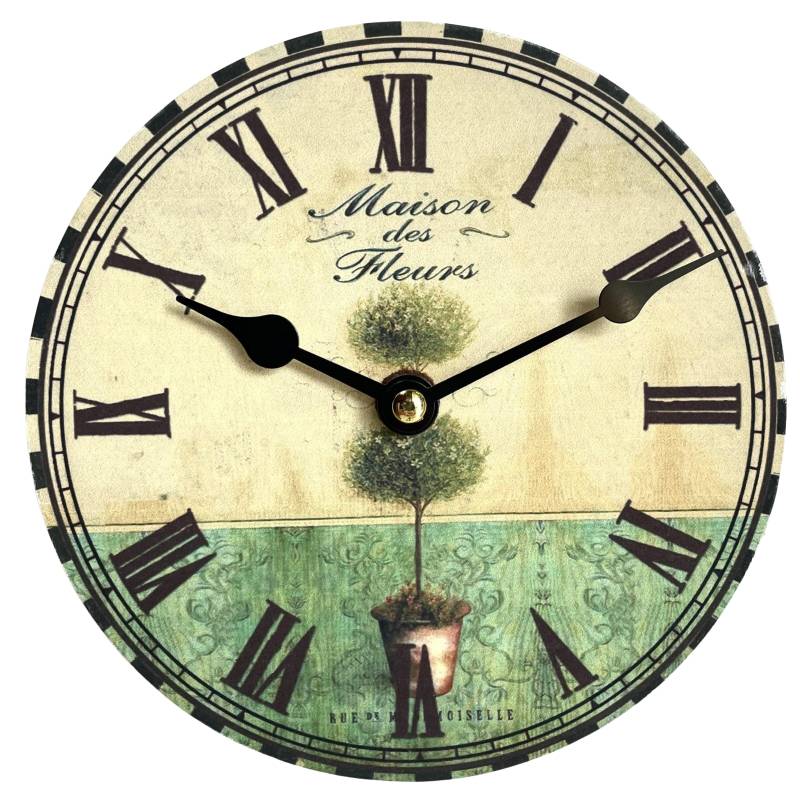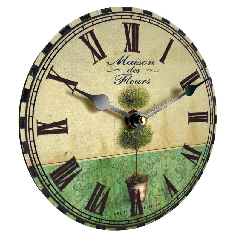 Le fond du cadran volontairement vieilli se décore d'un joli arbuste et de divers décors sur fond vert avec l'inscription "Maison des Fleurs", parfait pour donner un aspect authentique à cette pendule.