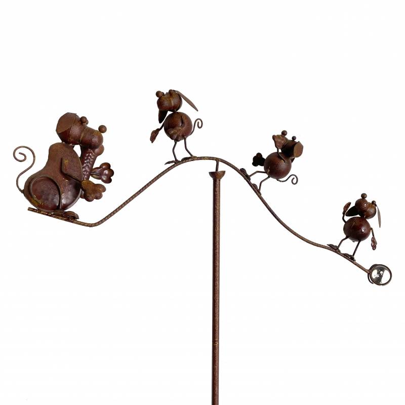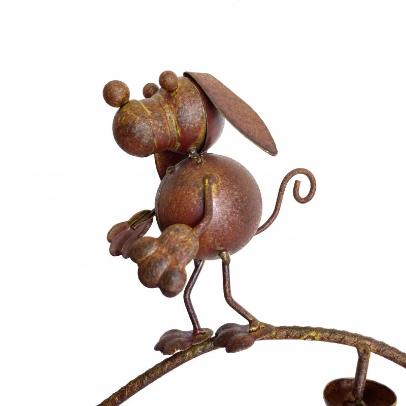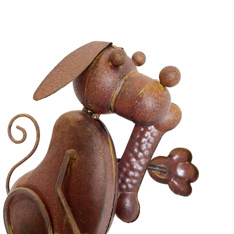 Un thème canin bien sympa pour ce mobile de jardin en métal patiné marron. Composé d'un grand chien tenant un os face à trois autres toutous plus petits, cette décoration de jardin amènera une touche d'humour dans votre environnement extérieur.