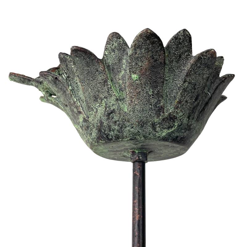 Fabriquée en fonte pour la coupelle, vous serez séduits par son travail et sa finition. Sa tige robuste en acier démontable est coiffée d’une jolie coupelle en forme de fleur sur laquelle repose deux petits oiseaux. Sa jolie patine couleur vert ancien lui apporte toute son authenticité. Vous apprécierez le travail sur le bénitier ou vous pourrez admirer le relief de la corolle et des nombreux pétales.