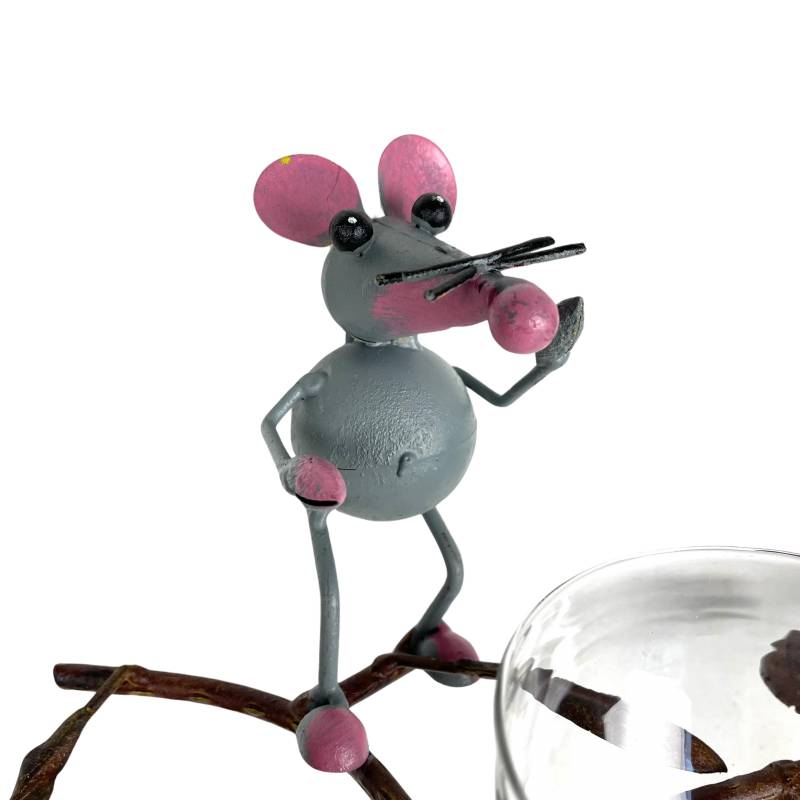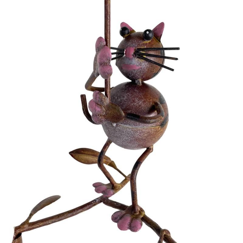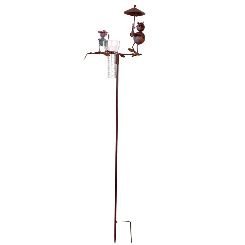 Ce magnifique pluviomètre est constitué d'une tige à piquer en métal patiné coloré, et d'une branche ornée d'une souris et d'un chat ainsi qu'un tube gradué de 0 à 35mm.