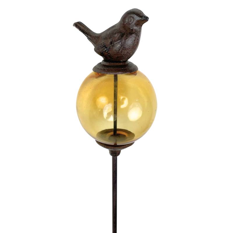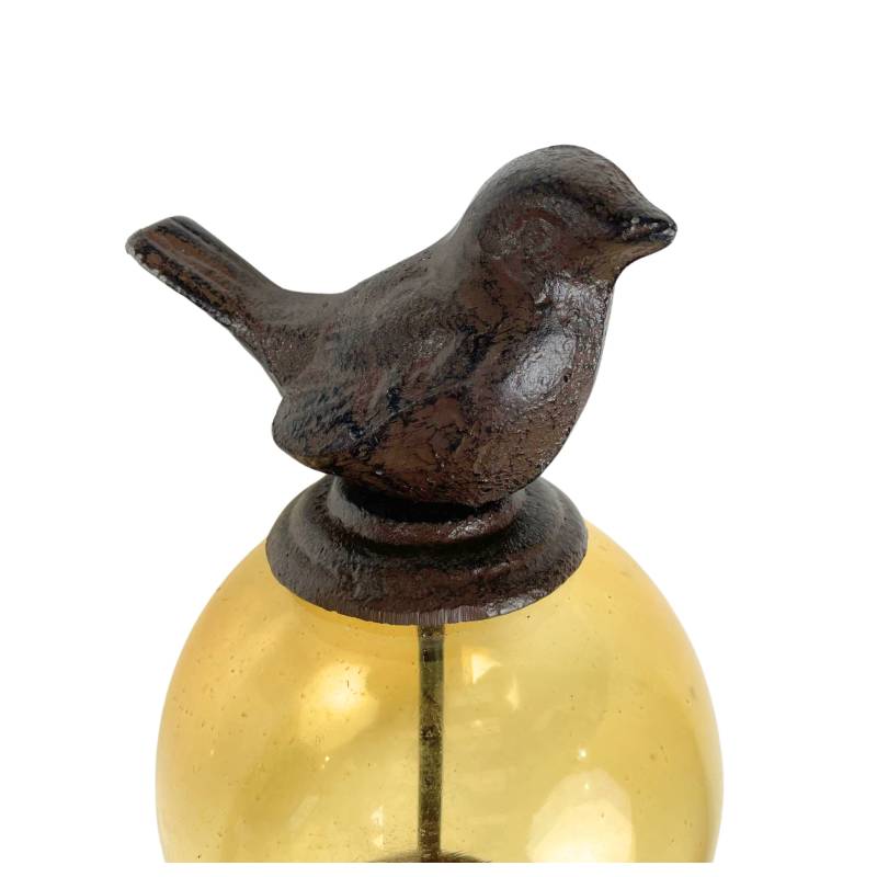 Sa longue tige est coiffée d’une boule décorée d’un délicat petit oiseau. La partie colorée est en verre teinté jaune alors que la tige et l’animal sont en fonte.