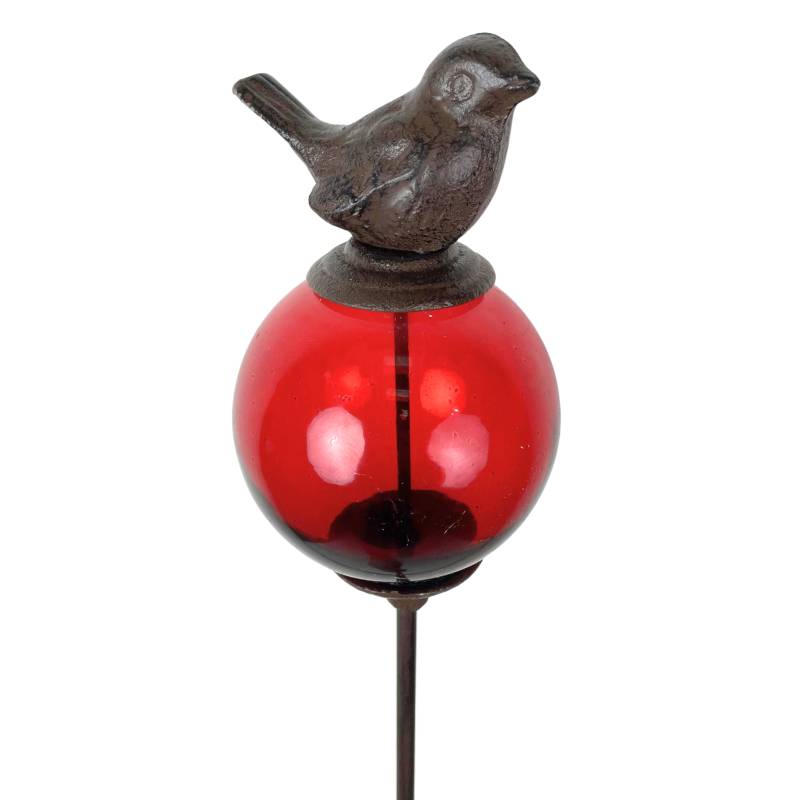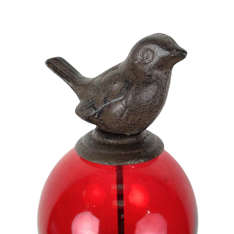 Sa longue tige est coiffée d’une boule décorée d’un délicat petit oiseau. La partie colorée est en verre teinté rouge alors que la tige et l’animal sont en fonte.