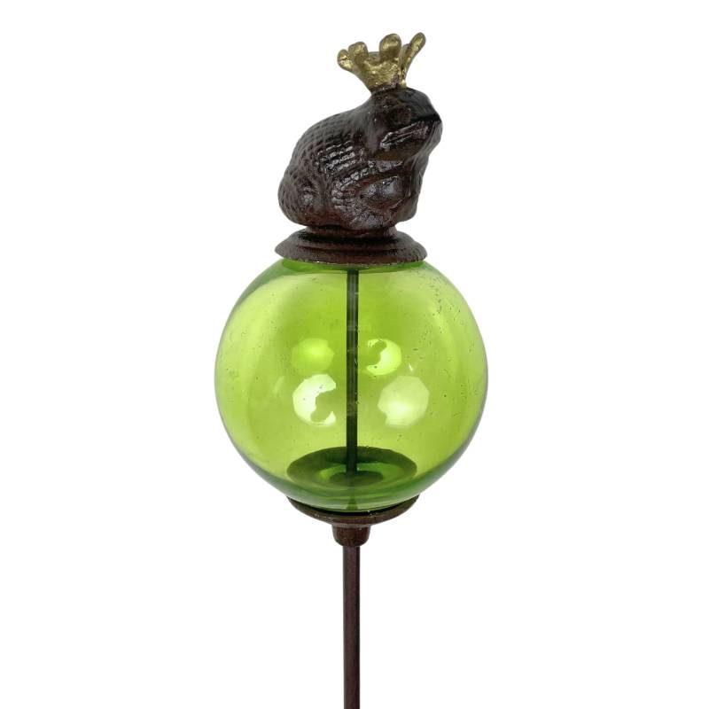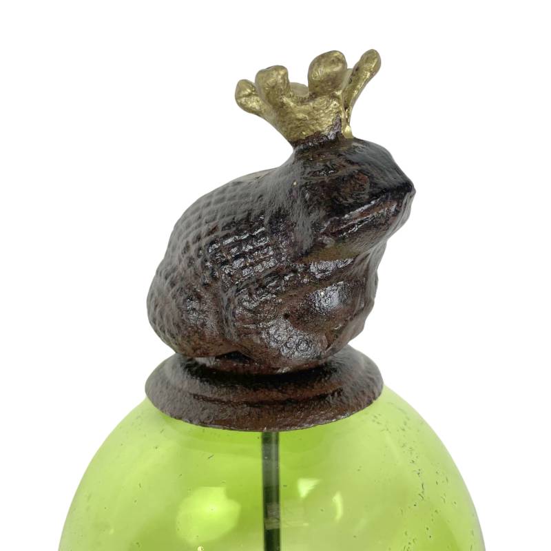 Sa longue tige est coiffée d’une boule décorée d’une magestueuse grenouille. La partie colorée est en verre teinté vert alors que la tige et l’animal sont en fonte.