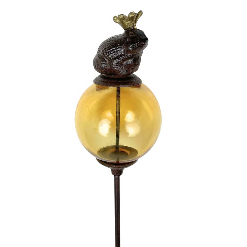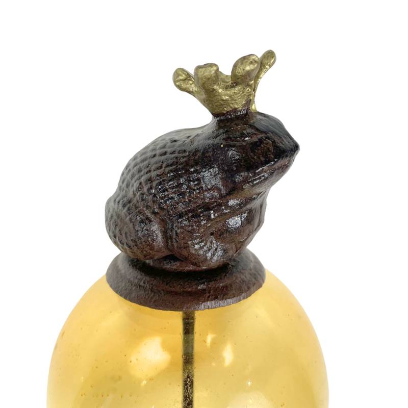 Sa longue tige est coiffée d’une boule décorée d’une magestueuse grenouille. La partie colorée est en verre teinté jaune alors que la tige et l’animal sont en fonte.
