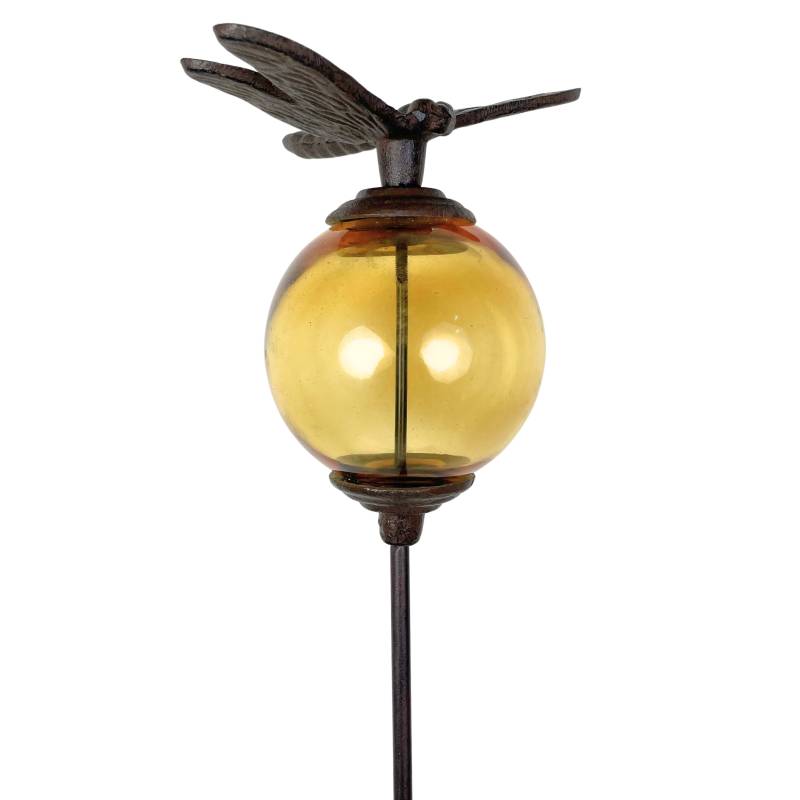 Sa longue tige est coiffée d’une boule décorée d’une gracieuse libellule. La partie colorée est en verre teinté jaune alors que la tige et l’animal sont en fonte.