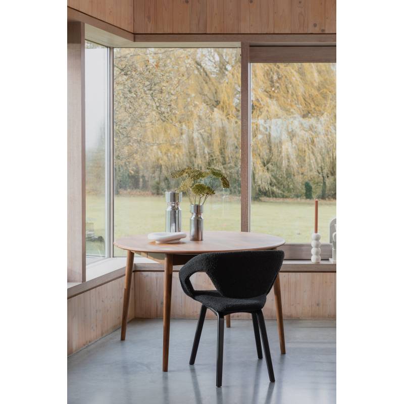 Montées sur un piètement en bois de hêtre, la coque de ces assises est habillée d’un joli tissu en bouclette couleur noire.