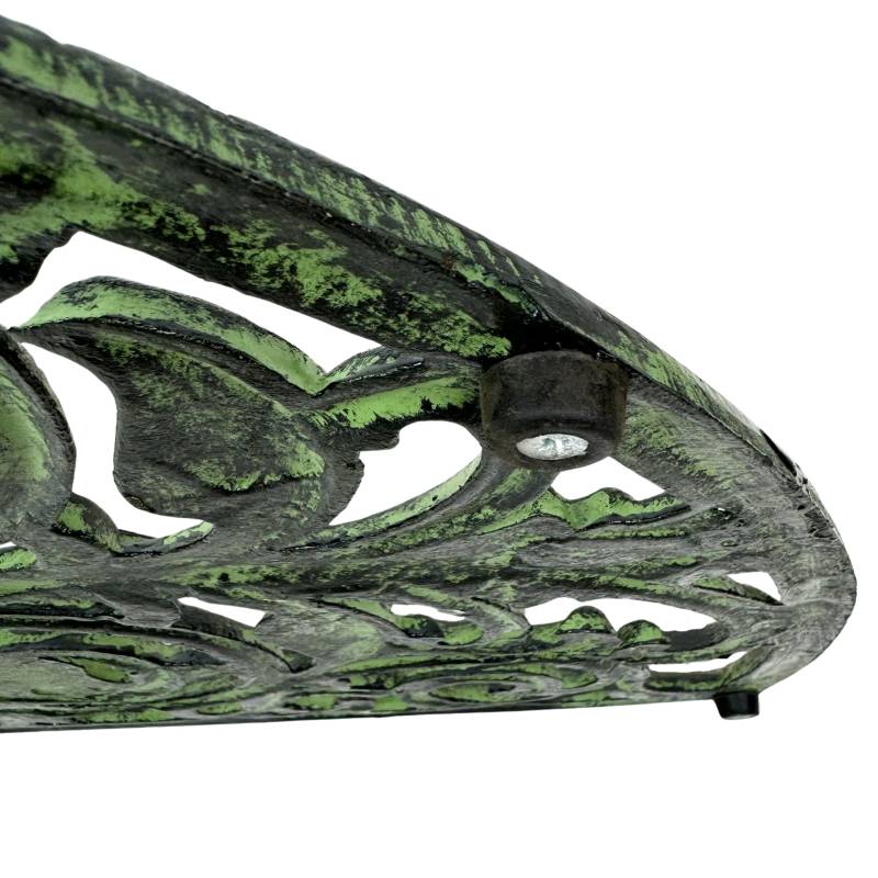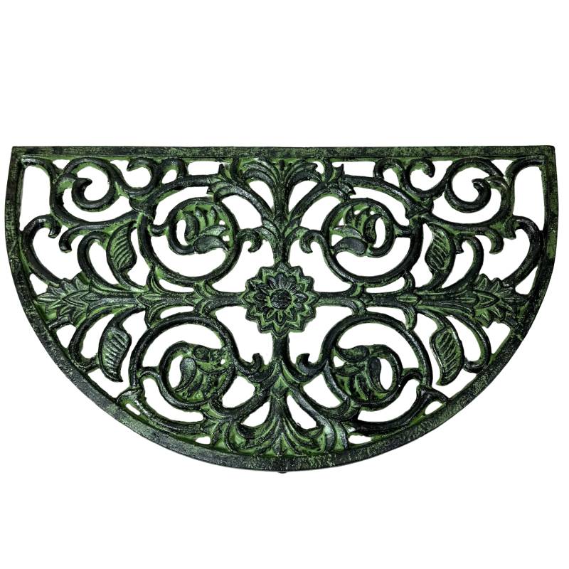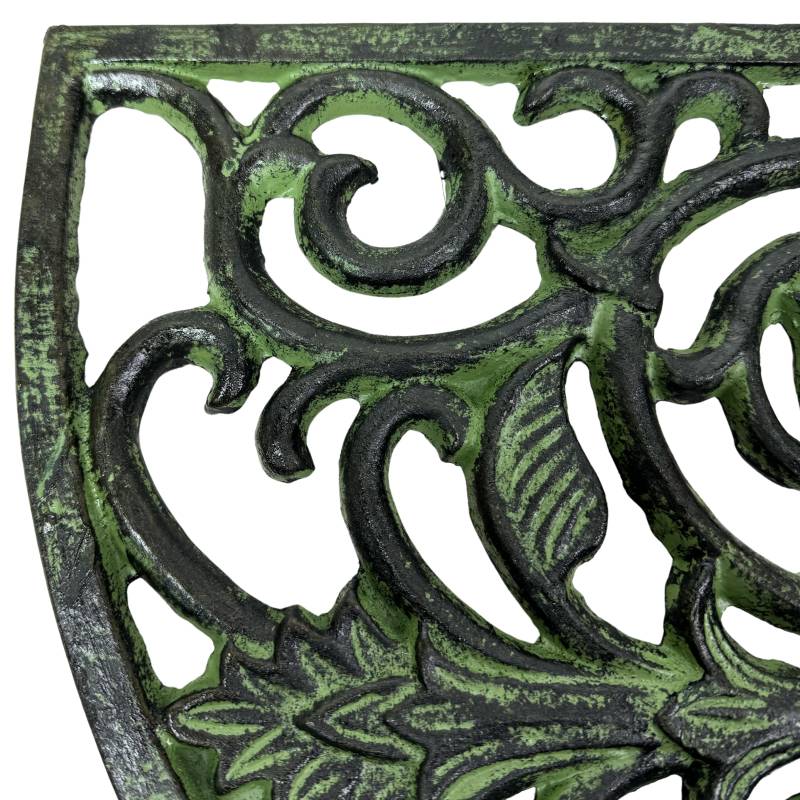 Ce très beau paillasson, en forme de demi lune, est en fonte de couleur verte. Il arbore de séduisants motifs symétriques: arabesques et feuilles. Sa conception en fonte, fait de lui un modèle robuste et extrêmement stable, qui traversera les saisons sans soucis.