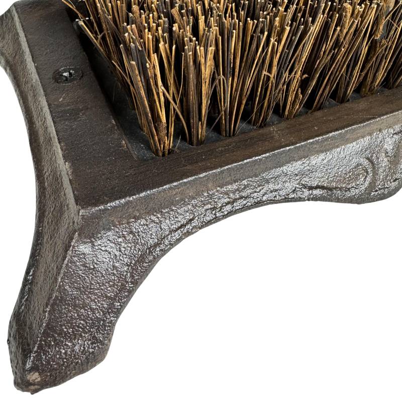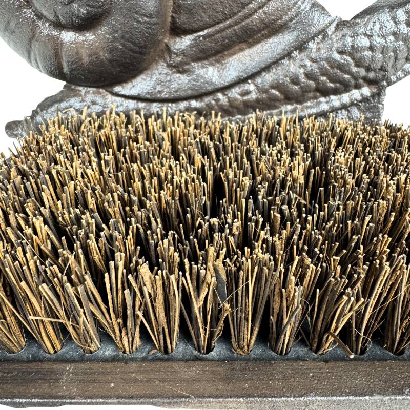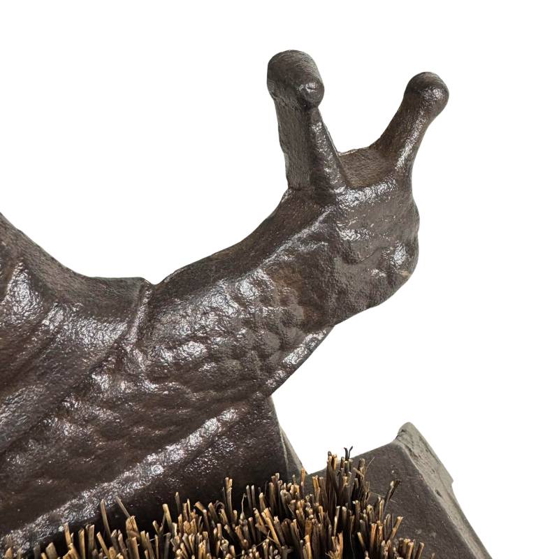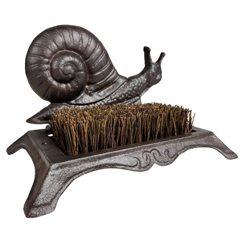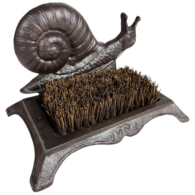 Ce gratte-pieds robuste et discret sera parfait au pied de votre porte d'entrée. Il est conçu en fonte patinée de couleur marron, décoré d'un joli motif escargot, et garni d'une brosse en fibre de coco.