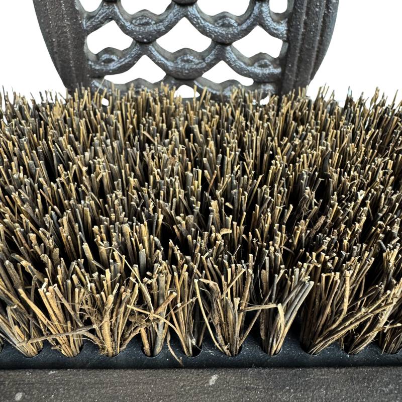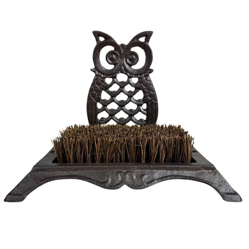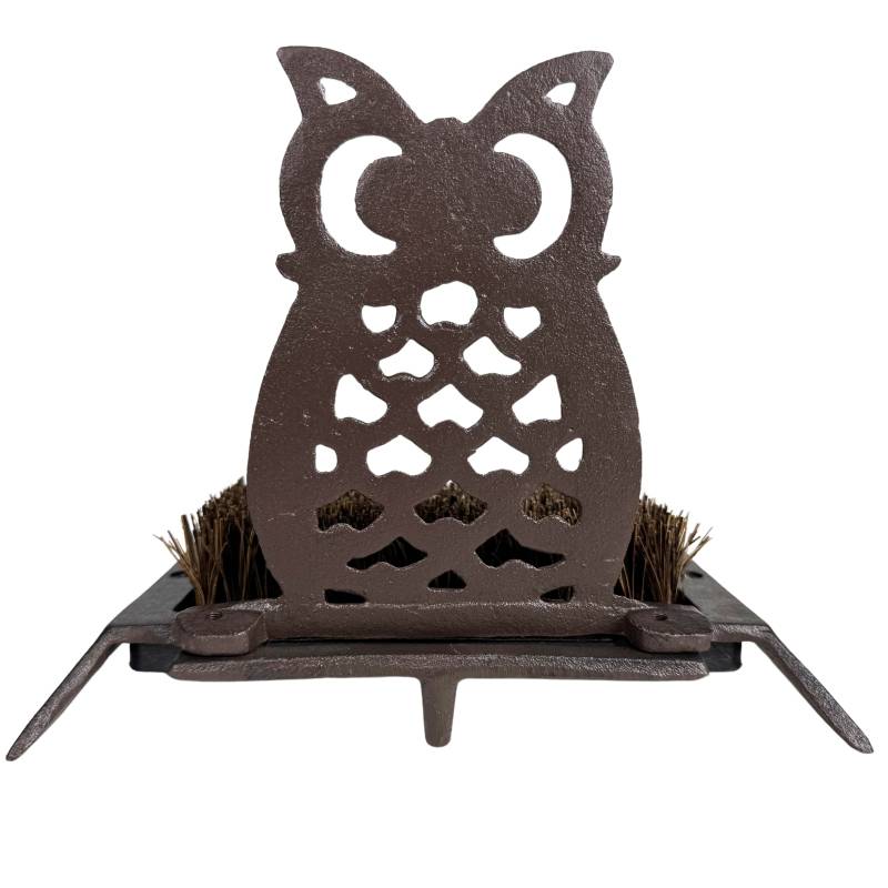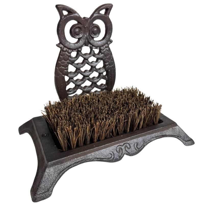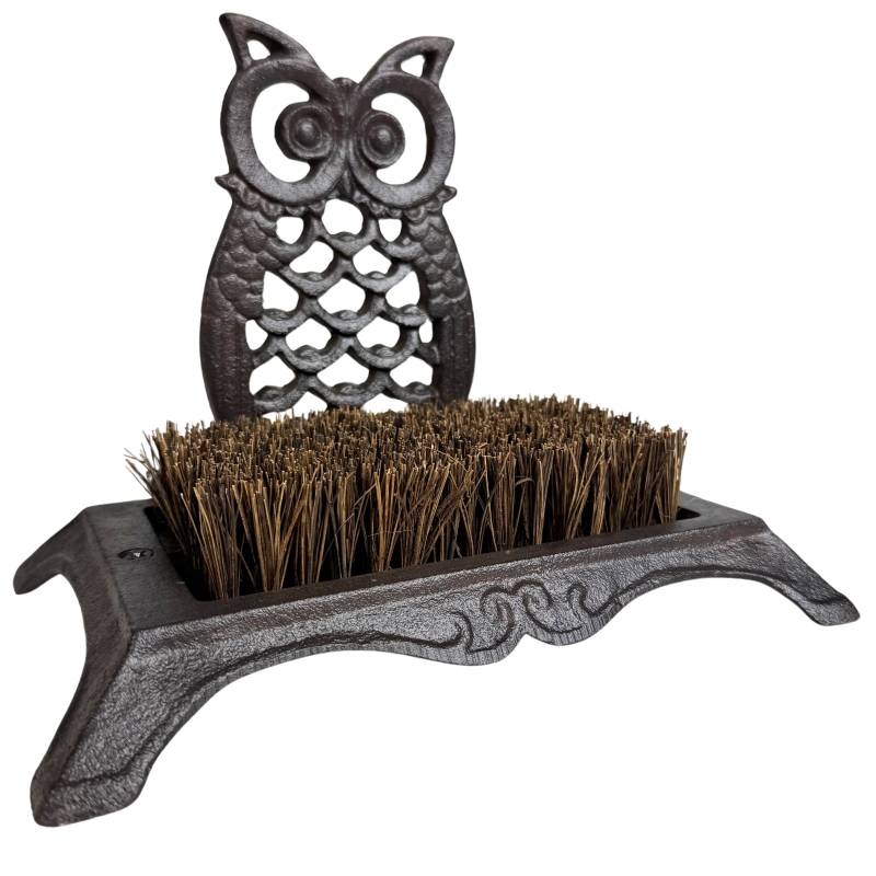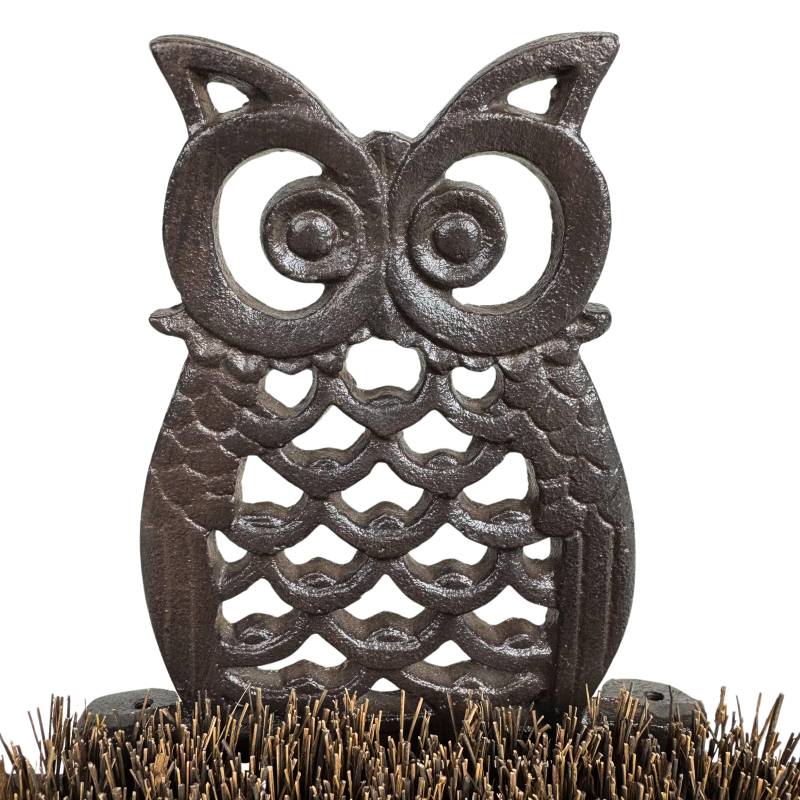 Ce gratte-pieds robuste et discret sera parfait au pied de votre porte d'entrée. Il est conçu en fonte patinée de couleur marron, décoré d'un joli motif hibou, et garni d'une brosse en fibre de coco.