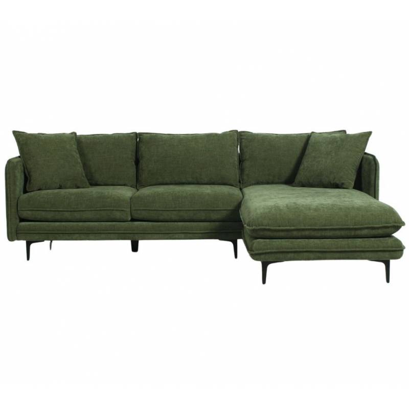 Sublime canapé d'angle en bois avec un garnissage en mousse pour ma structure, je suis recouvert d'un charmant tissu, ici, vert mousse. Mon joli piétement en acier noir me permet d'être parfaitement stable et de vous recevoir en toute sécurité !