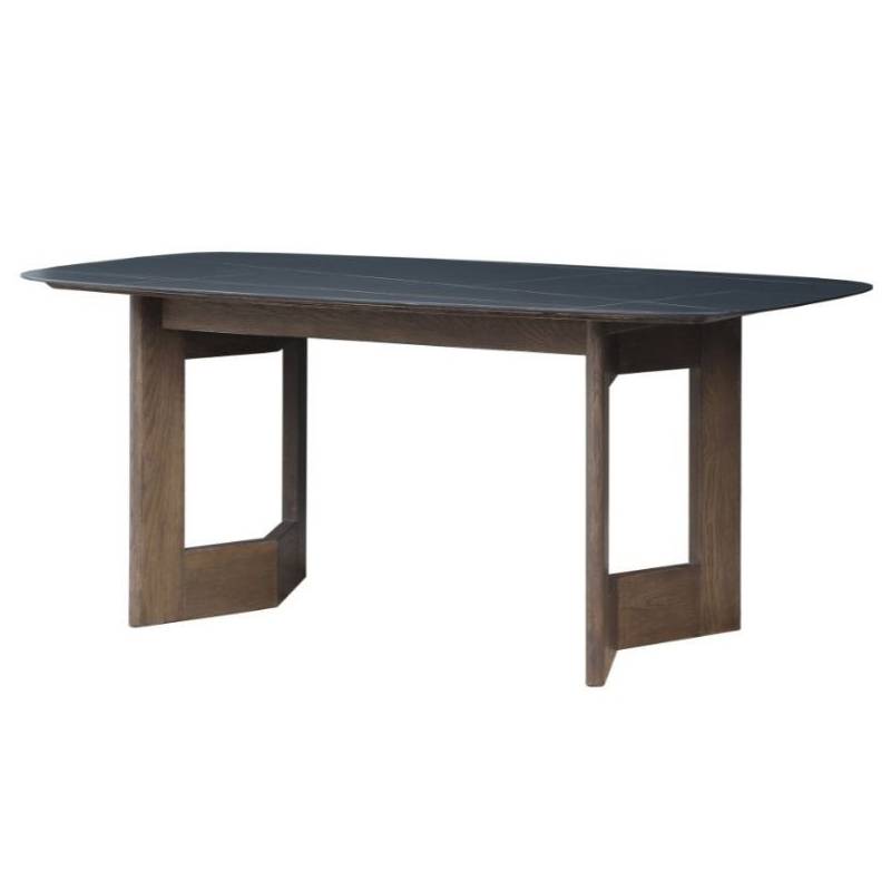 Son plateau en pierre frittée de couleur noire, repose sur un piétement V en chêne naturel, rendant cette table de salle à manger très stable et absolument sublime !