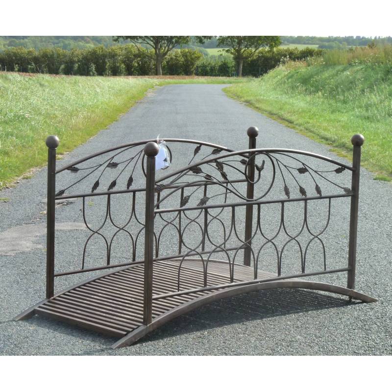 Conçu tout en acier patiné de couleur marron, ce pont offre une parfaite stabilité. Cet article est orné de jolies fleurs voluptueuses et d'arcs de cercles sur les gardes corps, qui viennent réhaussé son design déjà bien abouti.