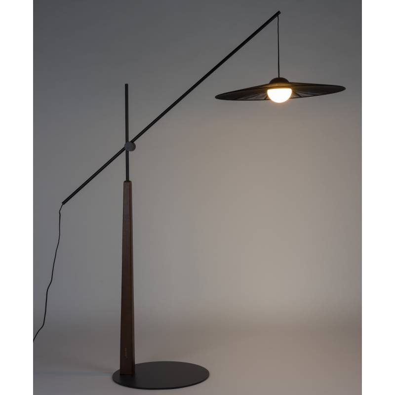 Son bras incliné et sa structure élancée apportent une silhouette graphique et moderne, tandis que le fut central en noyer réchauffent l’ensemble avec une touche naturelle et élégante. L'abat-jour permet une orientation droite ou légèrement inclinée.