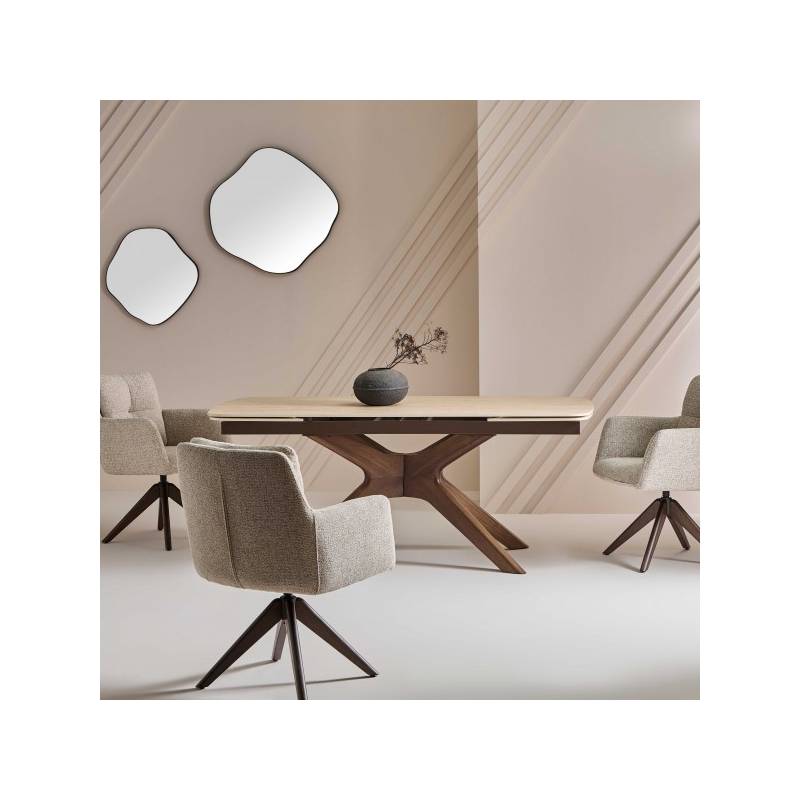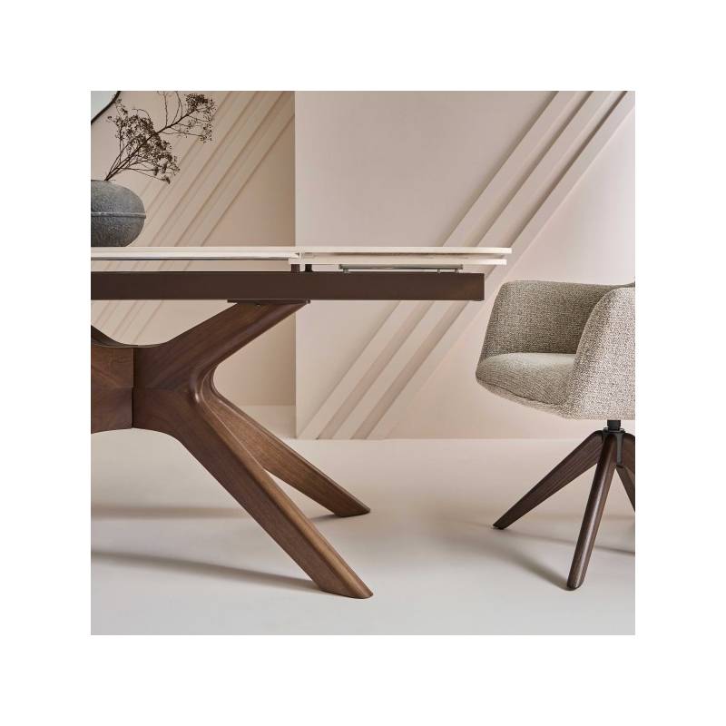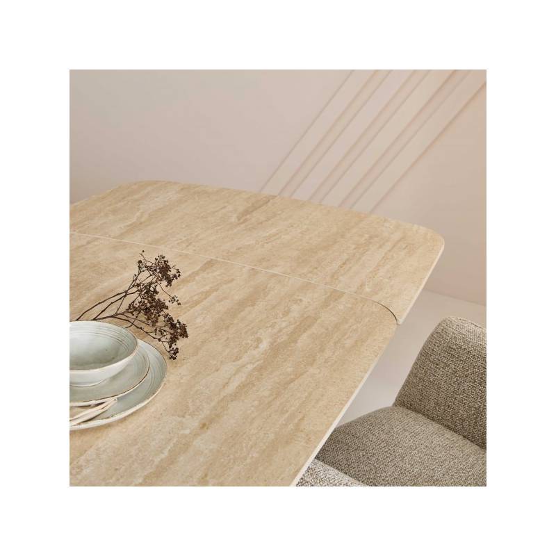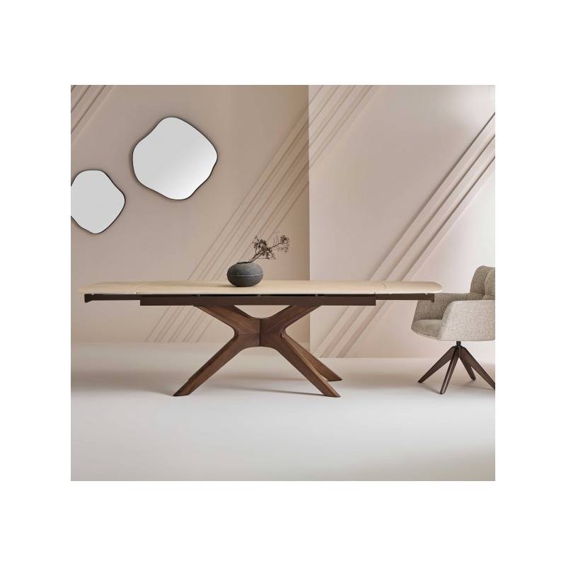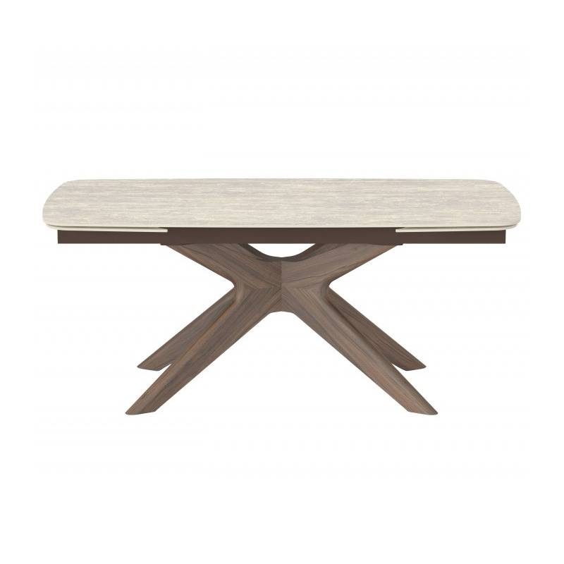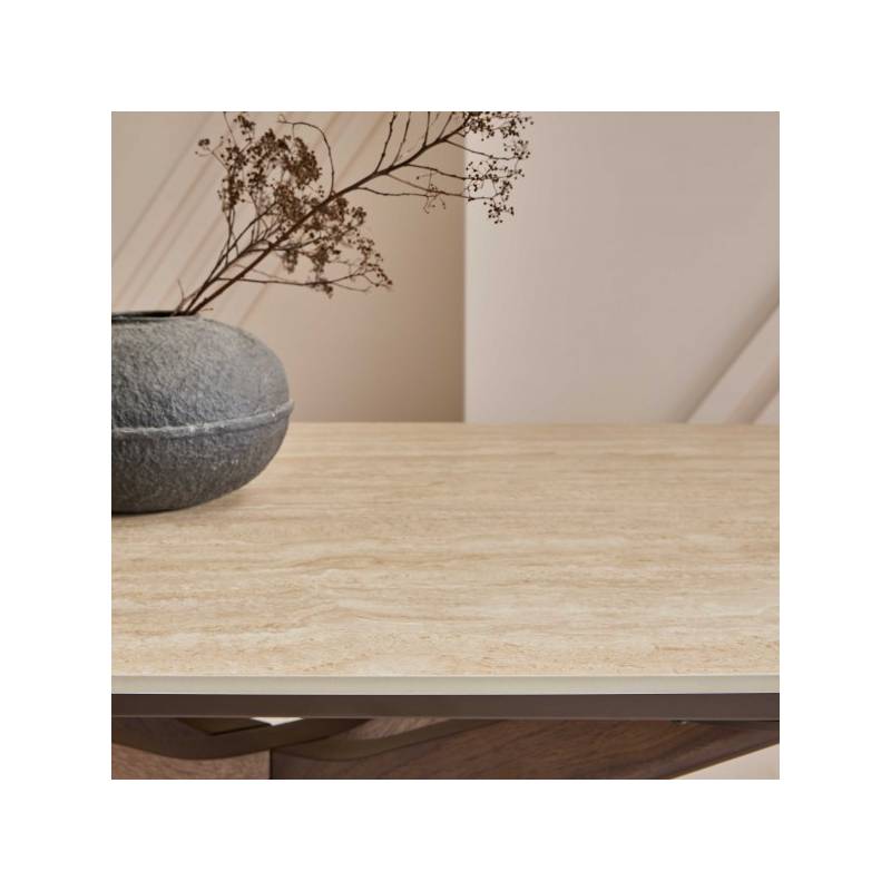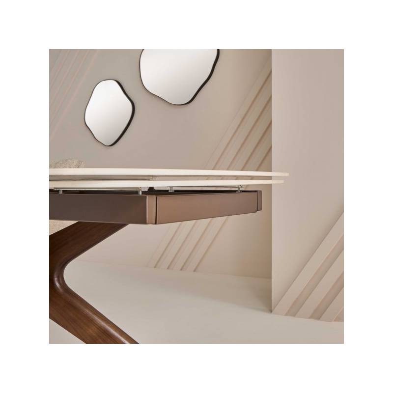 Son plateau en céramique dans les tons crème, à la fois esthétique et ultra-résistant, repose sur un piètement sculptural en bouleau avec un placage noyer.
