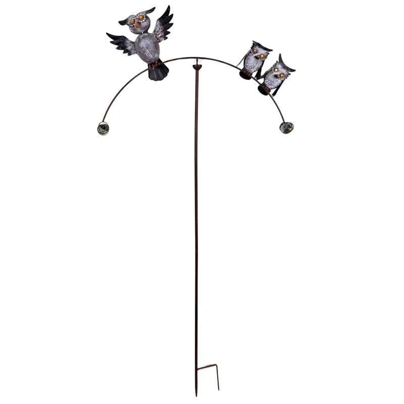 En métal coloré, ce tuteur pour plantes est composé d'une tige se terminant par un pic afin de le planter facilement dans votre sol. Il est doté d'une partie supérieure décorée de trois chouettes, l'une d'un côté de l'arc et deux autres de l'autre côté. La tige en arc de cercle posée sur le piquet se termine par une boule en verre plein de chaque côté.