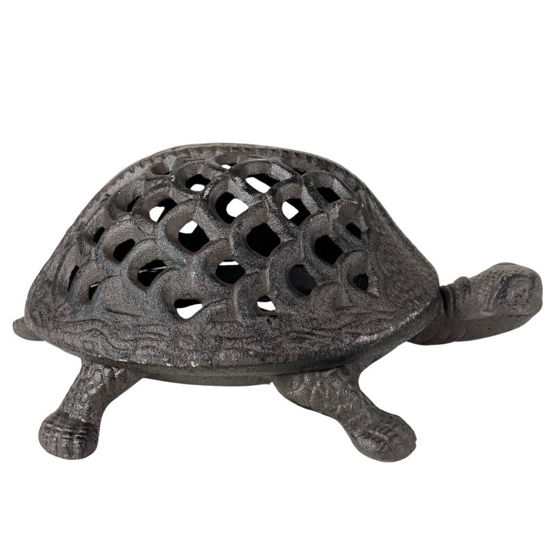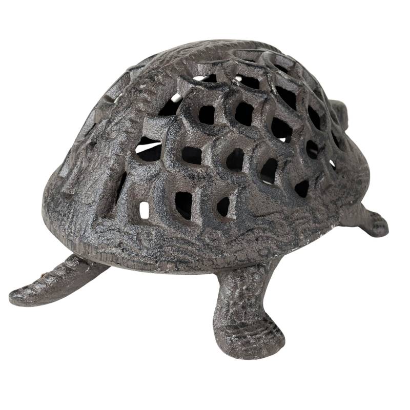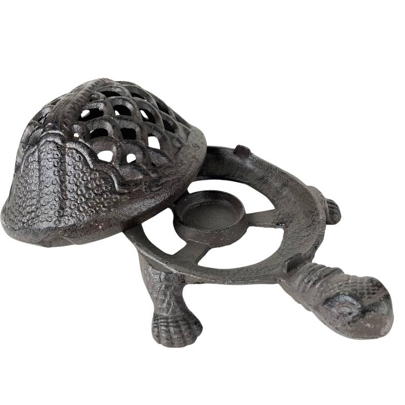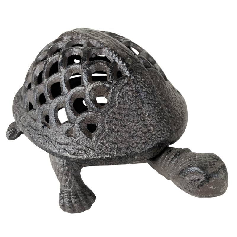 Ce bougeoir en forme de tortue a été fabriqué en fonte patinée marron. La carapace ajouré est amovible vous permettant un accès facile au réceptacle à bougie.
